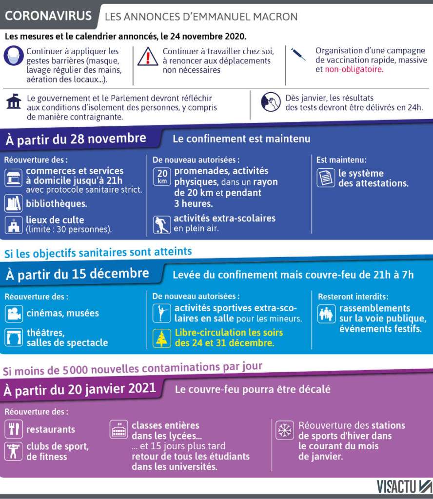 Enfin, le 20 Janvier 2021, si les conditions sanitaires s’améliorent, la fin du confinement sera annoncé avec la réouverture des bars et restaurants. « Ces cinq semaines seront décisives » a déclaré Jean Castex.