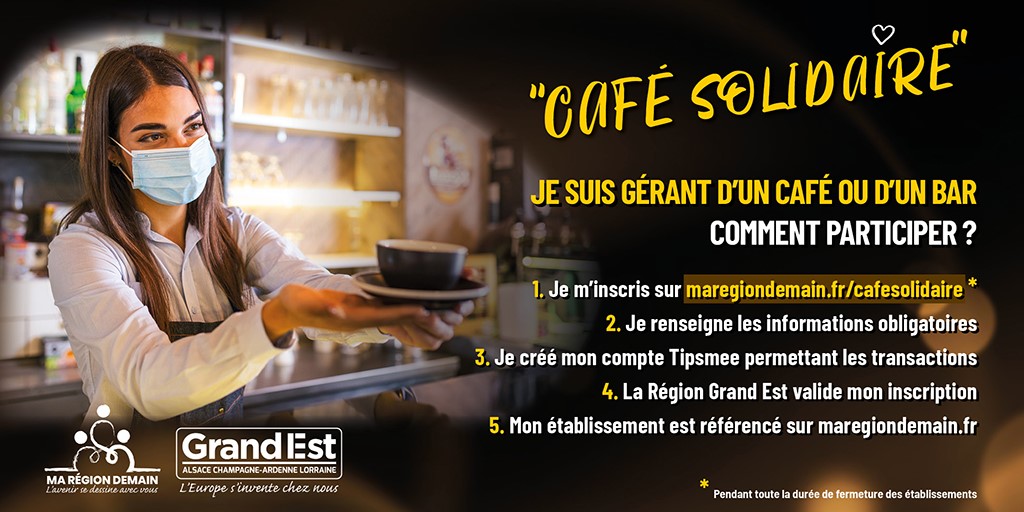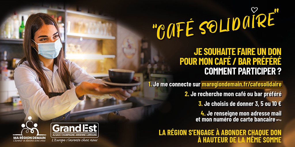 Ensemble, soutenons nos cafés et nos bars dans la région Grand Est ! Chaque habitant de la Région peut faire un don aux commerçants référencés sur la plateforme. Pour chaque don d’un particulier, la Région s’engage à abonder chaque don à hauteur de la même somme. C’est à dire que votre don de 5€ par exemple en rapporte 10€ à votre commerçant ! Que vous soyez habitant ou gérant d’un café ou d’un bar dans la Région Grand Est, découvrez comment soutenir ou être soutenu en participant à l’opération Café Solidaire.