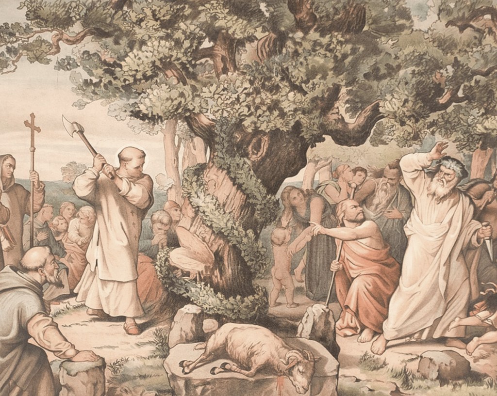 La légende veut que Saint Boniface, né en 680, en voulant convaincre les druides germains que le chêne n’était pas un arbre sacré, a abattu un chêne. En tombant, l’arbre aurait écrasé tout ce qui se trouvait sur son passage à l’exception d’un jeune sapin ! Dès lors, Saint Boniface a qualifié ce pur hasard de miracle, et déclaré dans sa même prédication : « Désormais, nous appellerons cet arbre, l’arbre de l’Enfant Jésus. » Depuis, en Allemagne, de jeunes sapins sont plantés pour célébrer la naissance du Christ.