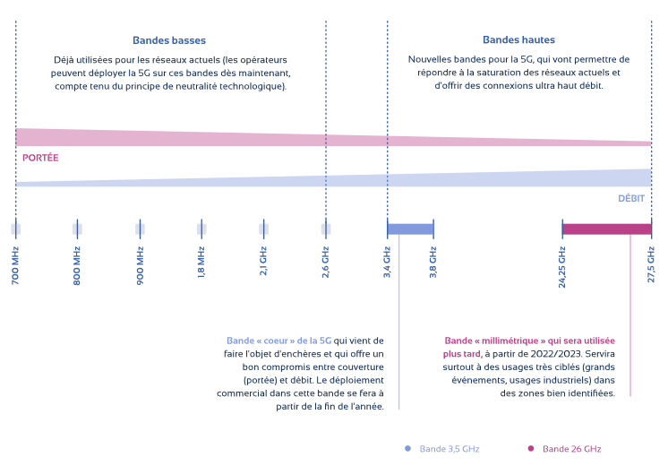 - les bandes 700 MHz et 2,1 GHz, dites « bandes basses », actuellement utilisées pour leurs réseaux 3G ou 4G, peuvent également accueillir la technologie 5G.