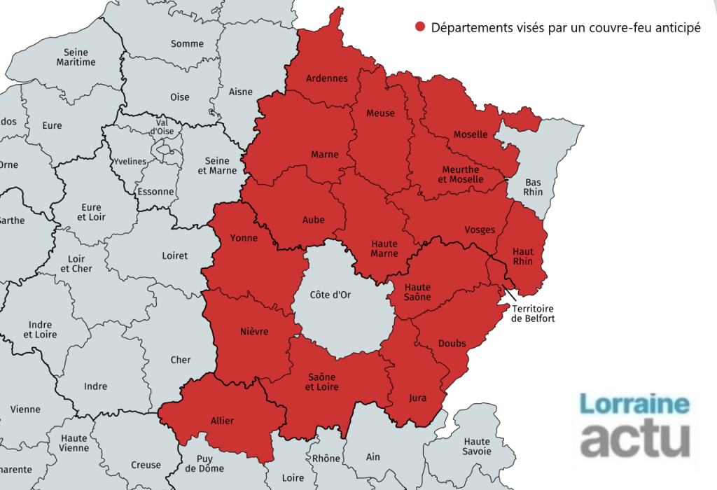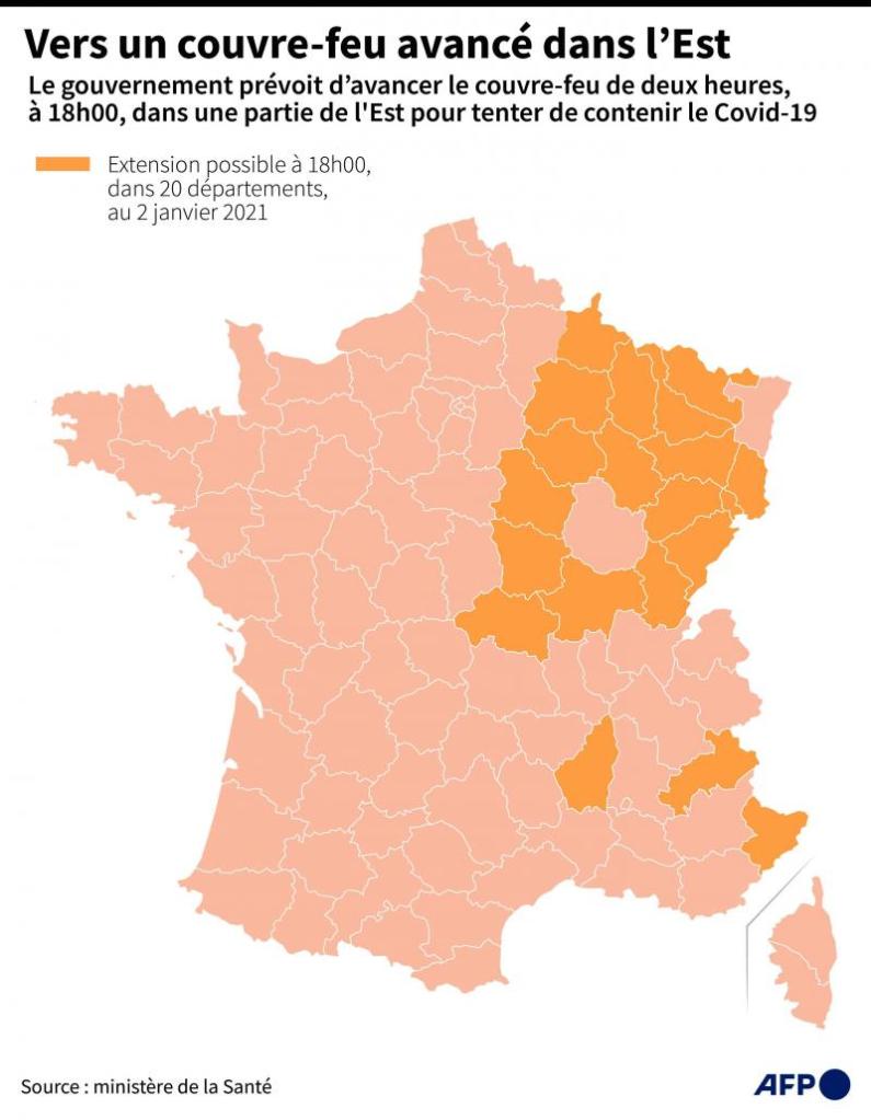 Le Ministre de la Santé a fait référence à 4 régions en situation de crise : le Grand Est, la Bourgogne Franche-Comté, le Provence-Alpes-Côte d’Azur et l’Auvergne Rhône-Alpes. Cela représente 20 départements soumis au nouveau couvre-feu à 18h00 dès le 2 Janvier.