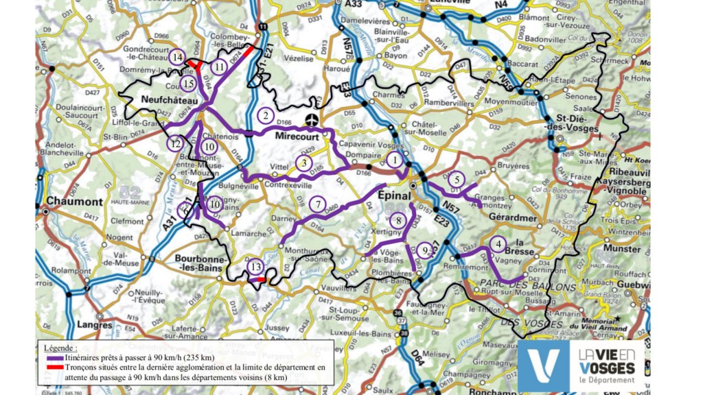 Cela représente un linéaire de 235 km hors agglomérations, soit 9,5 % du réseau routier départemental. S’y ajoutent les 5 km restants entre les dernières communes vosgiennes et les départements limitrophes de la Meuse et de la Meurthe-et- Moselle. Dans les Vosges, la mise en œuvre est effective depuis le 15 janvier 2021 pour un coût global de 140.000 euros.