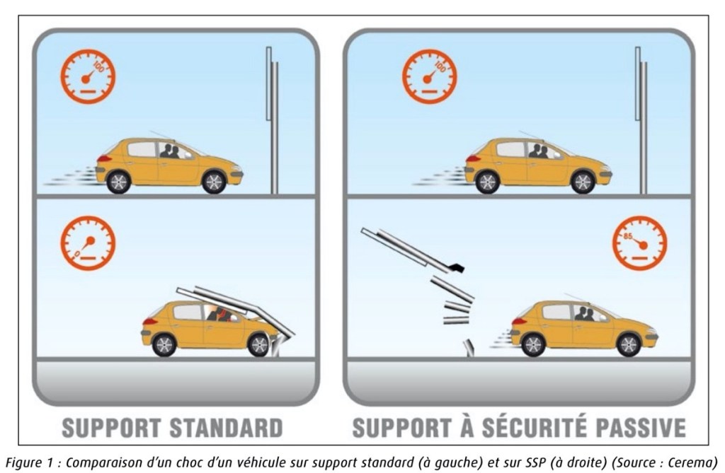 Ainsi, les ensembles de signalisation à considérer comme des obstacles sur la totalité des itinéraires portés à 90 km/h seront équipés de Supports à Sécurité Passive (SSP). Environ 200 Supports à Sécurité Passive (SSP) ont été installés pour un coût de 90 000 € TTC.