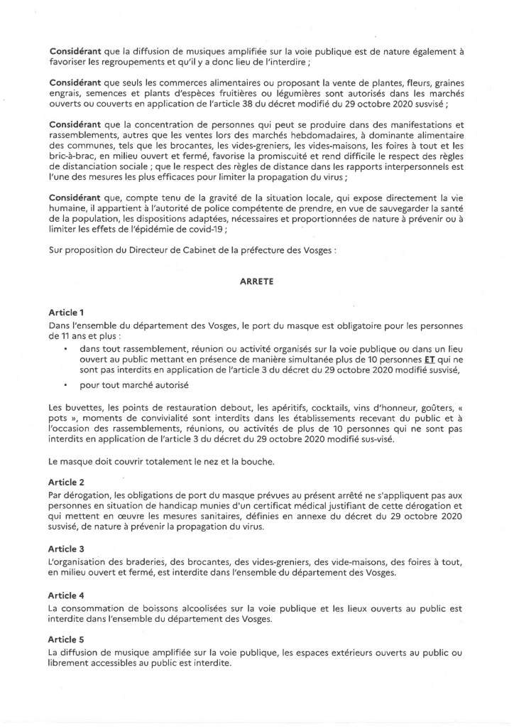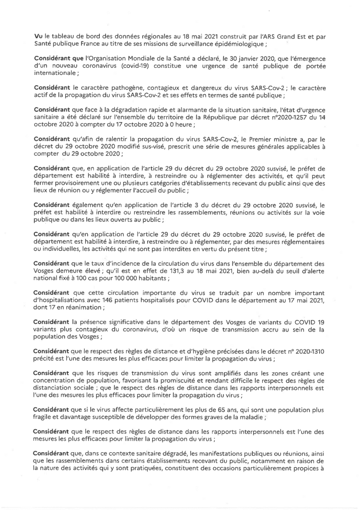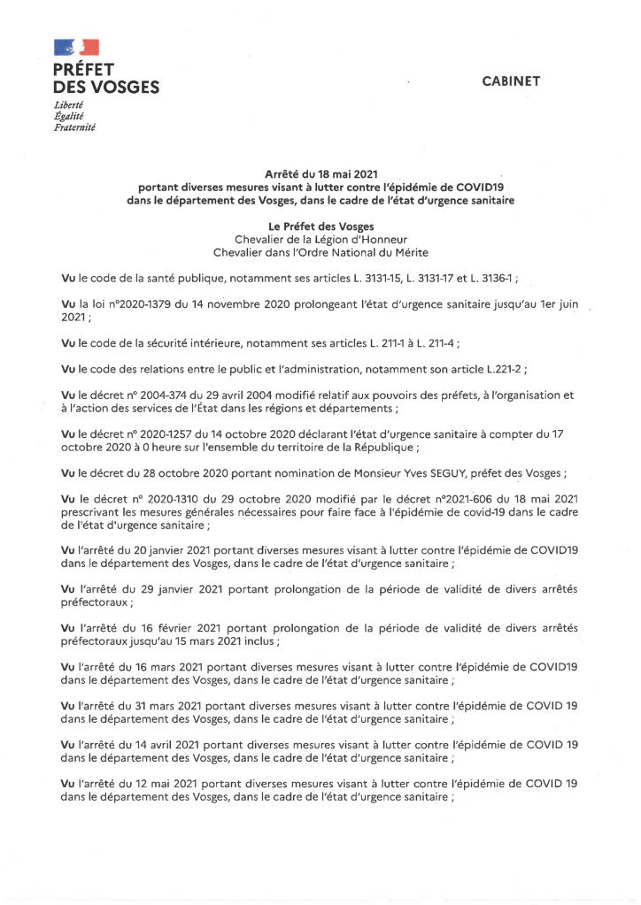 L’arrêté préfectoral portant diverses mesures visant à lutter contre l’épidémie de COVID-19 dans le département des Vosges est ci-joint : ces mesures s’applique jusqu’au 9 juin 2021 inclus.