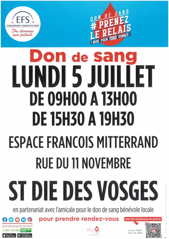 La prochaine collecte de sang mobile à Saint-Dié-des-Vosges se tiendra ce 5 Juillet, à l’Espace François-Mitterrand de 9h00 à 13h00 puis de 15h30 à 19h30.