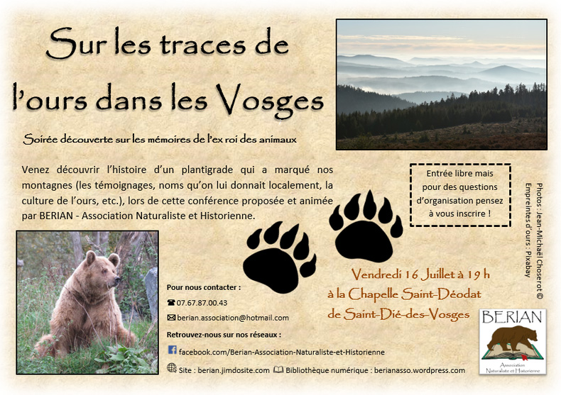 L’association BERIAN organise une soirée découverte sur les traces de l’ours dans les Vosges vendredi 17 Juillet prochain : rien d’étonnant lorsque l’on sait que le mot Berian signifie Ours en dialecte lorrain.