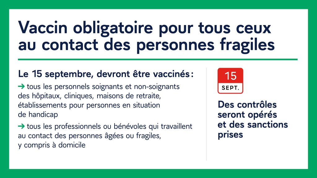 La vaccination devient obligatoire pour les soignants et les membres d’autres professions en contact avec des personnes « fragiles ».