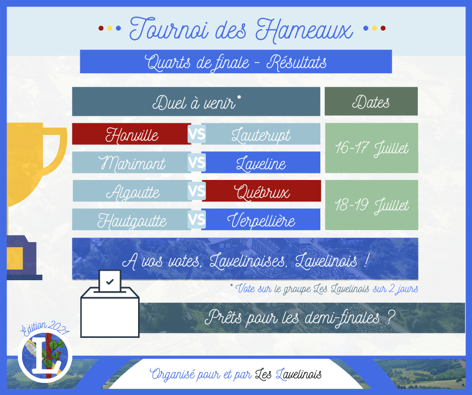 Le 18 et 19 Juillet, le hameau de Verpellière et de Québrux s’affronteront à leur tour ! Les votes se feront également sur le groupe Les Lavelinois de 8h00 le 18 à 21h00 le 19.