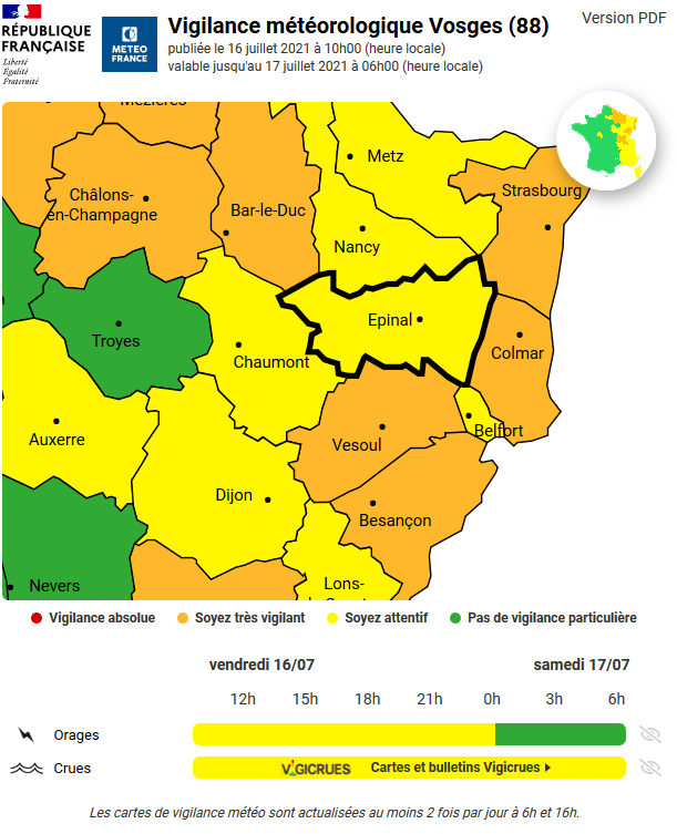 Météo-France vient de placer ce matin le département des Vosges en vigilance jaune pour des risques d’orages et de crues, pour toute la journée de vendredi et jusqu’à 2h du matin cette nuit.