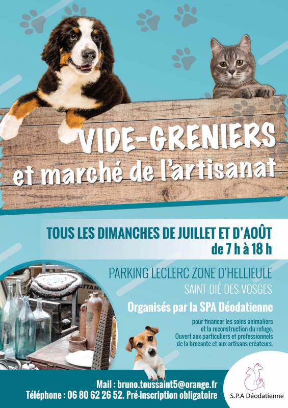 Ce dimanche 29 Août a eu lieu le dernier vide-greniers et marché de l’artisanat estival organisé par la SPA Déodatienne. Malgré la météo automnale, exposants et visiteurs étaient nombreux sur le parking du E.Leclerc de la zone d’Hellieule.