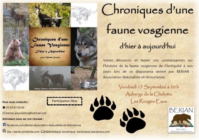 L’association naturaliste et historienne BERIAN vous invite à une soirée découverte de l’histoire de la faune vosgienne le vendredi 17 Septembre.