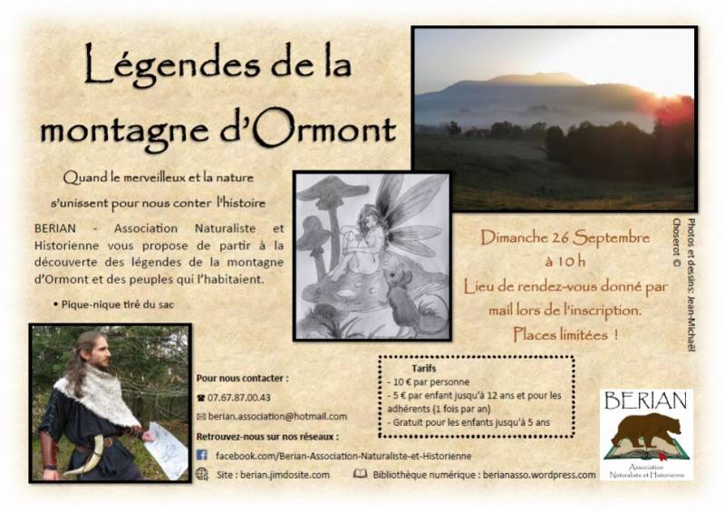 L’association naturaliste et historienne BERIAN organise une nouvelle balade sur les sentiers de l’Ormont, à la découverte des légendes locales ! Rendez-vous dimanche 26 Septembre à 10h00, lieu précisé lors de l’inscription !