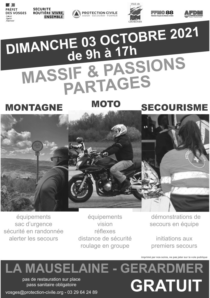 La Préfecture des Vosges, la Sécurité Routière, la Protection Civile, la ville de Gérardmer, la FFMC 88 et l’AFDM organisent ce dimanche 3 Octobre à Gérardmer une journée de sensibilisation sur le triptyque Montagne, Moto et Secourisme.