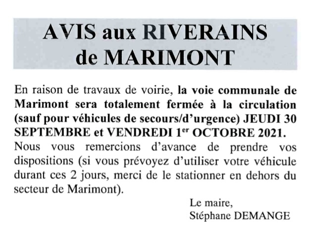 En raison de travaux de voirie, la route de Marimont sera fermée à la circulation les 30 Septembre et 1er Octobre 2021.