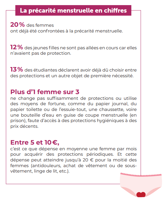 La précarité menstruelle est le fait de ne pas avoir les moyens d’acheter des protections périodiques et des produits d’hygiène pendant ses règles.