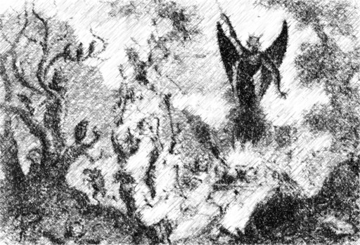 S’engeant ardemment dans le sous-bois, il aperçut alors un cercle lumineux avec un jeune damoiseau vêtu comme un prince et semblable à Belzébuth en personne !