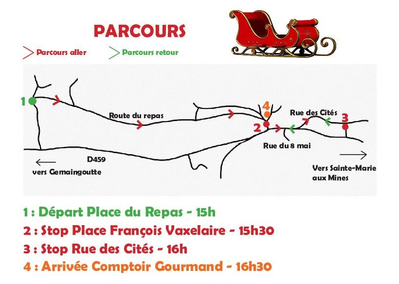 L’arrivée de ce défilé se fera au Comptoir Gourmand vers 16h30 après une longue procession dans le bourg wisabé : lors de cette arrivée, un goûter réconfortant sera proposé aux petits comme aux grands !
