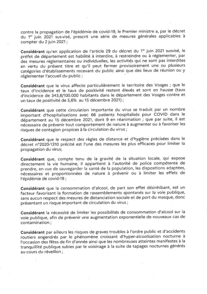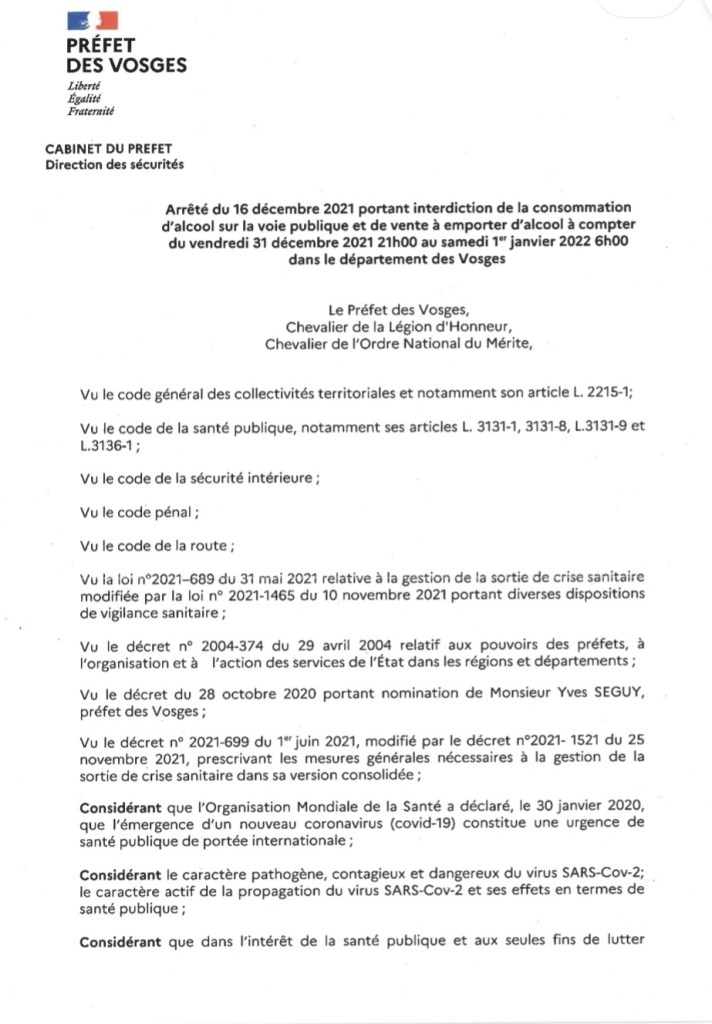 Le préfet des Vosges a publié un arrêté portant l’interdiction de consommation d’alcool sur la voie publique et de vente à emporter d’alcool à compter du 31 Décembre 2021 à 21h00 au 1er Janvier 2022 à 6h00 sur toutes les Vosges.