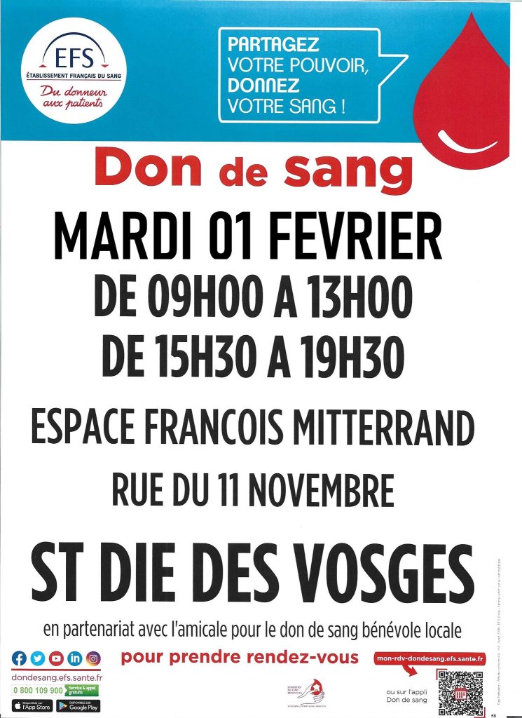 Unique rendez-vous de Février pour les donneurs de sang à Saint-Dié, ce mardi 1er Février aura lieu donc une collecte à l’Espace François-Mitterrand, de 9h00 à 13h00 et de 15h30 à 19h30 !