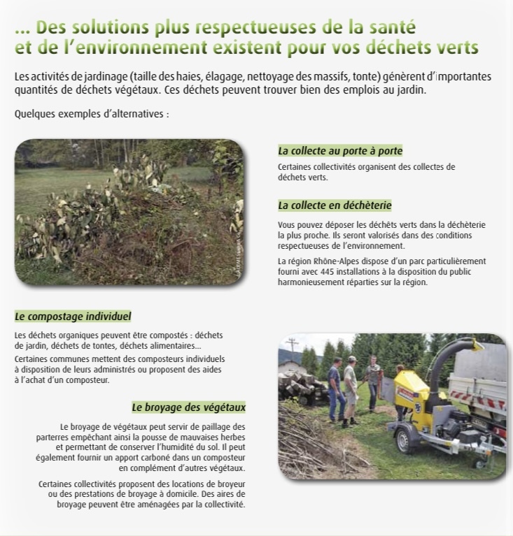 Des solutions plus respectueuses pour la santé et l’environnement existent pour vos déchets verts comme la collecte au porte à porte, la collecte en déchèterie, le compostage individuel et le broyage des végétaux.