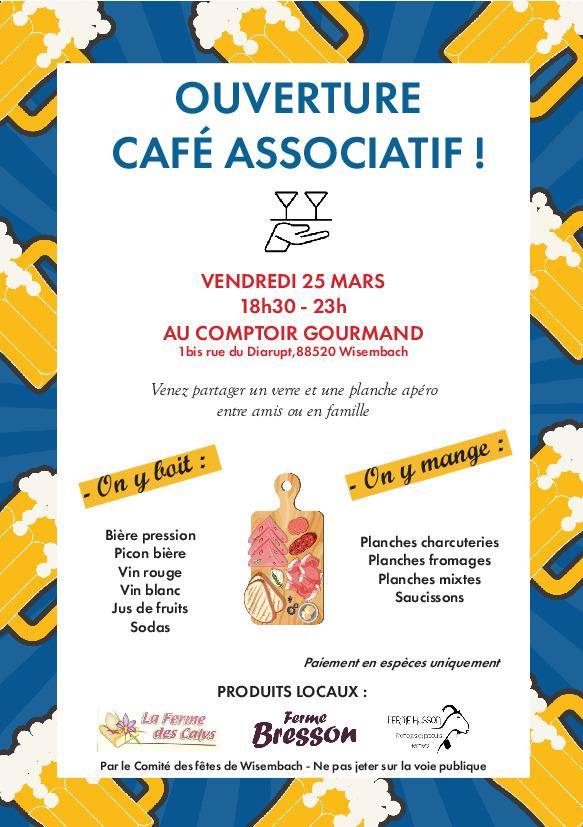 Le Comité des Fêtes de Wisembach vous invite à l’ouverture de son café associatif le vendredi 25 Mars 2022 à partir de 18h30 au Comptoir Gourmand, au 1 bis rue du Diarupt.