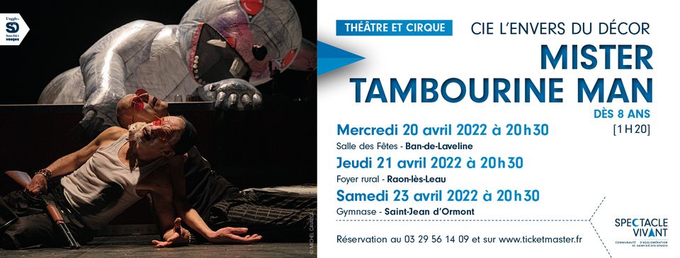 Rendez-vous le mercredi 20 Avril 2022 à 20h30 à la Salle des Fêtes de Ban-de-Laveline pour assister au spectacle vivant Mister Tambourine Man, proposé par la compagnie L’envers du décor !
