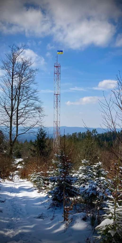 Des drapeaux ukrainiens flottent en toute Laveline ! Un de ces drapeaux flotte au sommet de l’ancien relais de télévision au Carrefour des Cerfs, lieu de montagne où se côtoient les communes de Wisembach, de Gemaingoutte et de Ban-de-Laveline.