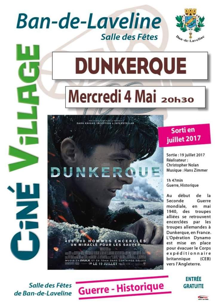 Après 2 ans d’absence, le Ciné Village de Ban-de-Laveline revient en force en ce 4 Mai 2022 ! Pour cette reprise, l’équipe vous propose le film Dunkerque de Christopher Nolan !