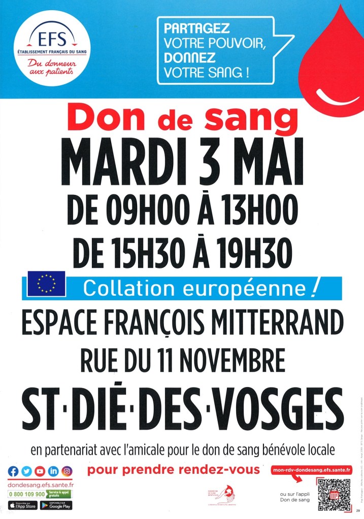 Rendez-vous le mardi 3 Mai 2022 de 9h00 à 13h00 et de 15h30 à 19h30 à l’Espace François-Mitterrand pour une collecte de sang sous le signe de l’Europe !