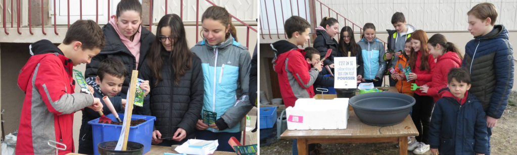 Suite à l’atelier de semis du 12 Mars 2022 et au beau développement des semis, il était donc temps de rempoter tout cela pour les jeunes jardiniers bertrimonastériens !