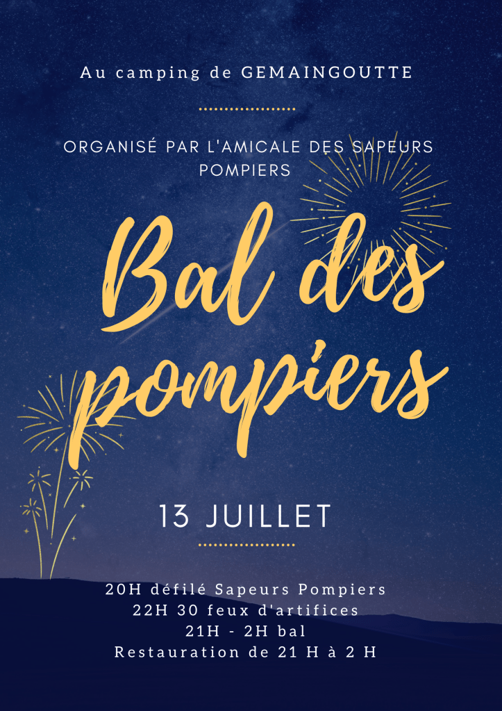 Rendez-vous le 13 Juillet prochain dès 20h00 au camping Le Violu de Gemaingoutte pour le Bal des Pompiers, organisé par l’Amicale des Sapeurs-Pompiers !