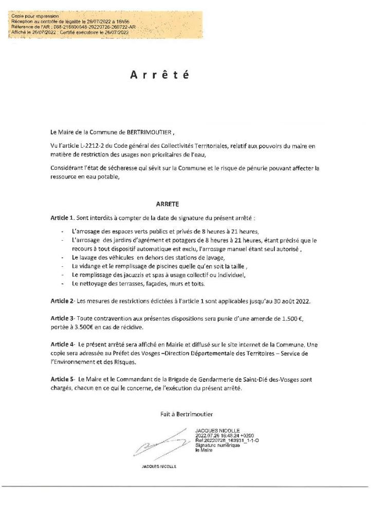 Dans cet optique, un arrêt municipal a été pris depuis le 26 Juillet et s’appliquera jusqu’au 30 Août inclus, sauf si l’évolution de la situation le demande. Prenez connaissance de cet arrêté ci-dessous.