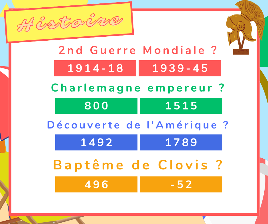 Pour cette 3ème partie du cahier de vacances, retour sur l’Histoire de France ! Connaissez-vous vos dates ? Voici un petit quizz d’histoire pour vérifier cela !