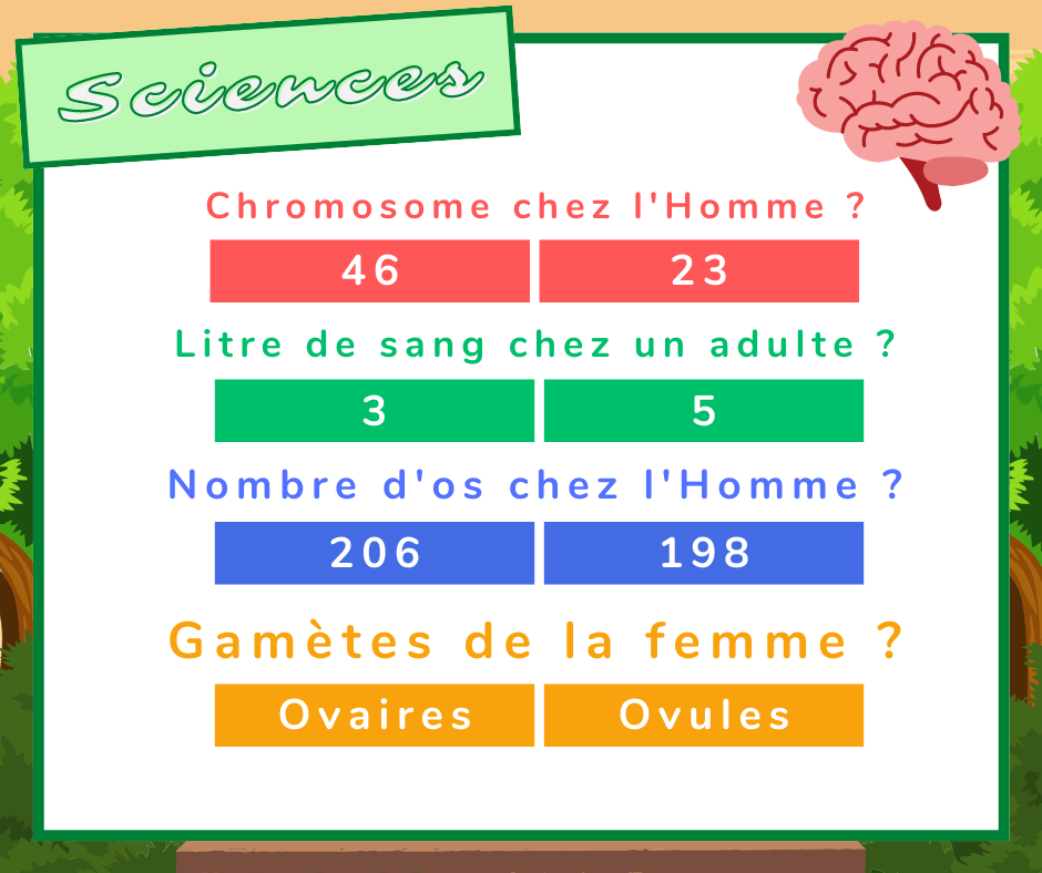 Pour cette 4ème partie du cahier de vacances, étudions la « géographie » de l’humain : les Sciences ! Voici un petit quizz de sciences pour tester vos connaissances !