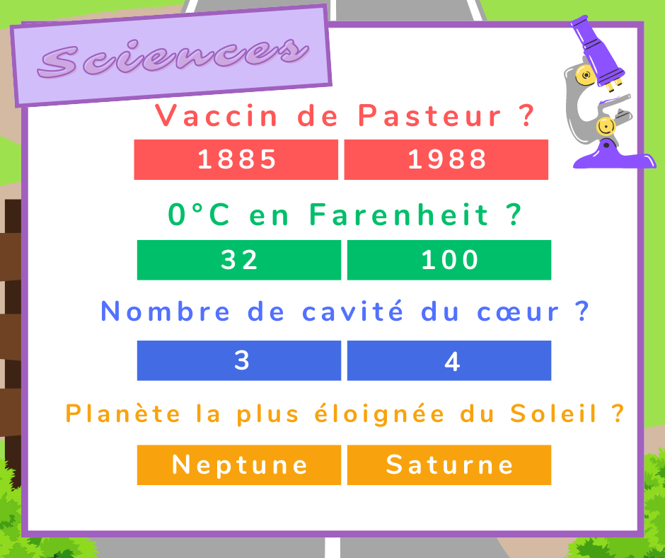Pour cette 4ème partie du cahier de vacances, après l’Histoire, voici l’ »histoire de la nature » : les Sciences ! Voici un petit quizz de sciences pour tester vos connaissances !