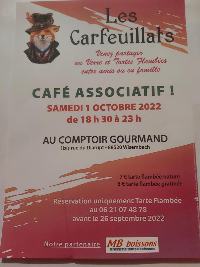 Après les succès des premières éditions, les Carfeuillats organisent à nouveau leur Café associatif : ce nouveau rendez-vous convivial aura lieu le samedi 1er Octobre 2022 de 18h30 à 23h00 au Comptoir Gourmand.