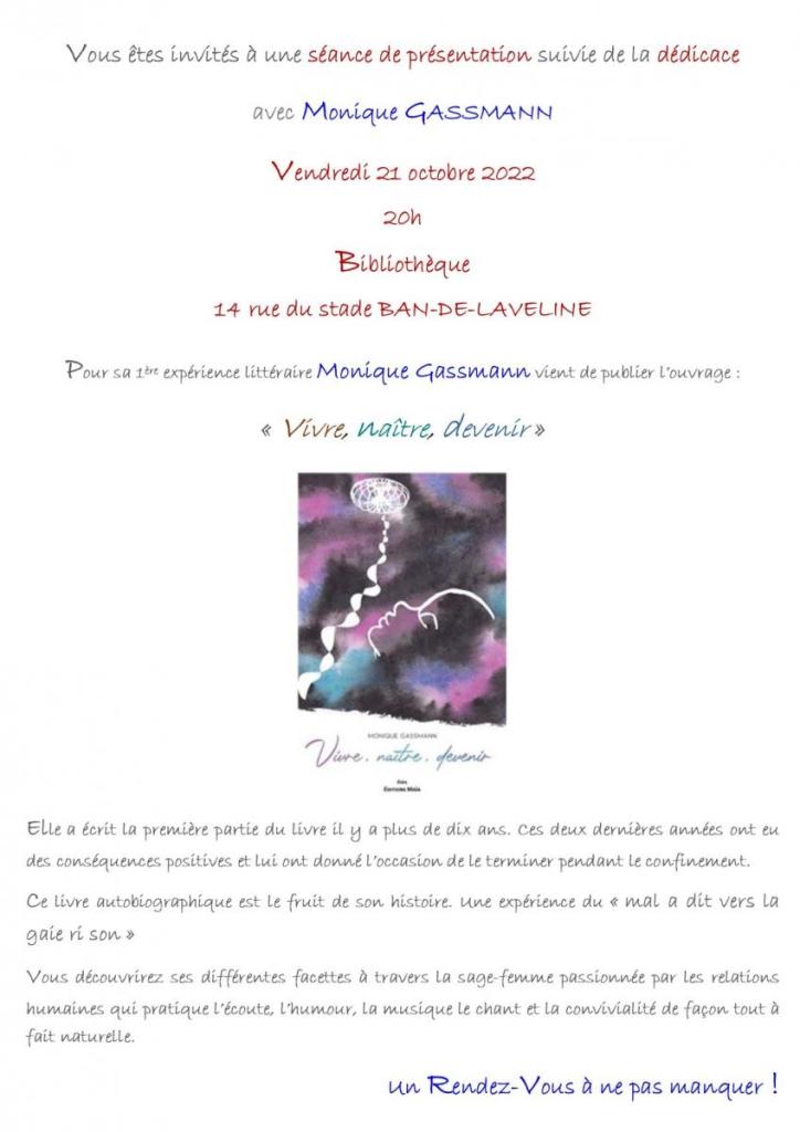 Rendez-vous le vendredi 21 Octobre 2022 à la Bibliothèque de Ban-de-Laveline dès 20h00 pour assister à une présentation suivie d’une dédicace de l’œuvre de Monique Gassmann, une auteure lavelinoise !