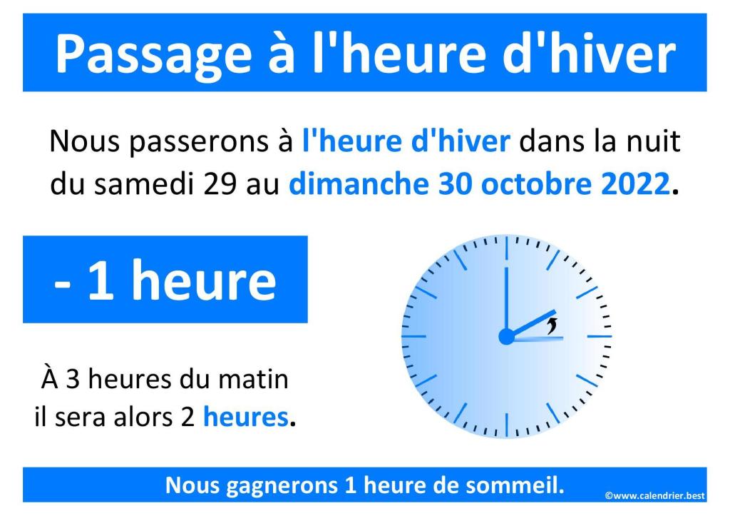 Le passage à l’heure d’hiver se fera dans la nuit du samedi 29 au dimanche 30 Octobre : on recule d’une heure, ainsi à 3h00 du matin, il sera donc 2h00 ! Cette heure nocturne supplémentaire fera le bonheur des « gros dormeurs » !