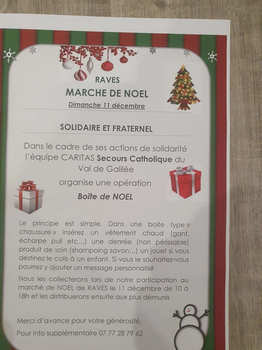 Les boîtes de Noël seront collectés cette année encore lors du marché de Noël de Raves demain 11 Décembre, où l’équipe CARITAS aura un stand dédié ! Plus d’informations au 07 77 28 79 62.