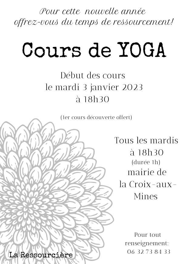 Rendez-vous tous les mardis dès 18h30 à la mairie de La Croix-aux-Mines pour assister pendant une heure aux cours de yoga, dispensé par La Ressourcière. Plus de renseignements au 06 32 73 84 33.