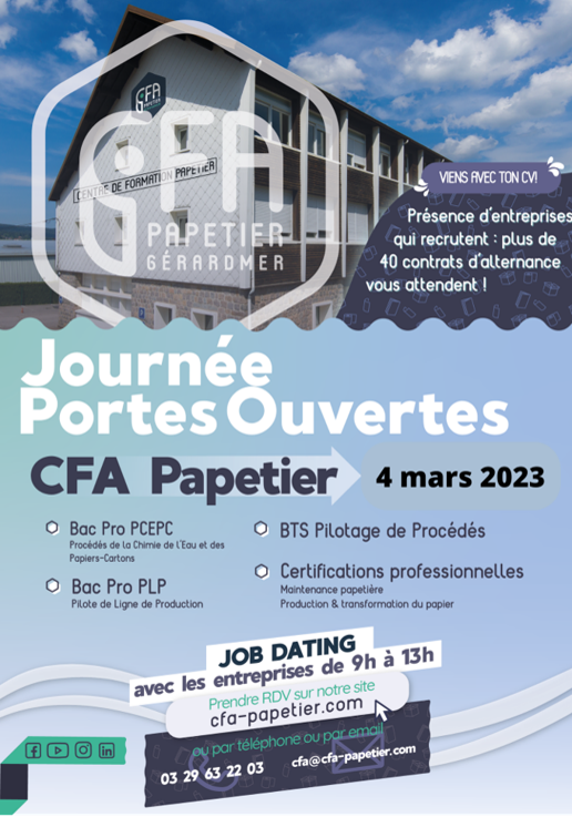 Le CFA Papetier de Gérardmer organise une journée Portes Ouvertes le samedi 4 Mars 2023 pour y faire découvrir la filière innovante qu’est celle du papier !