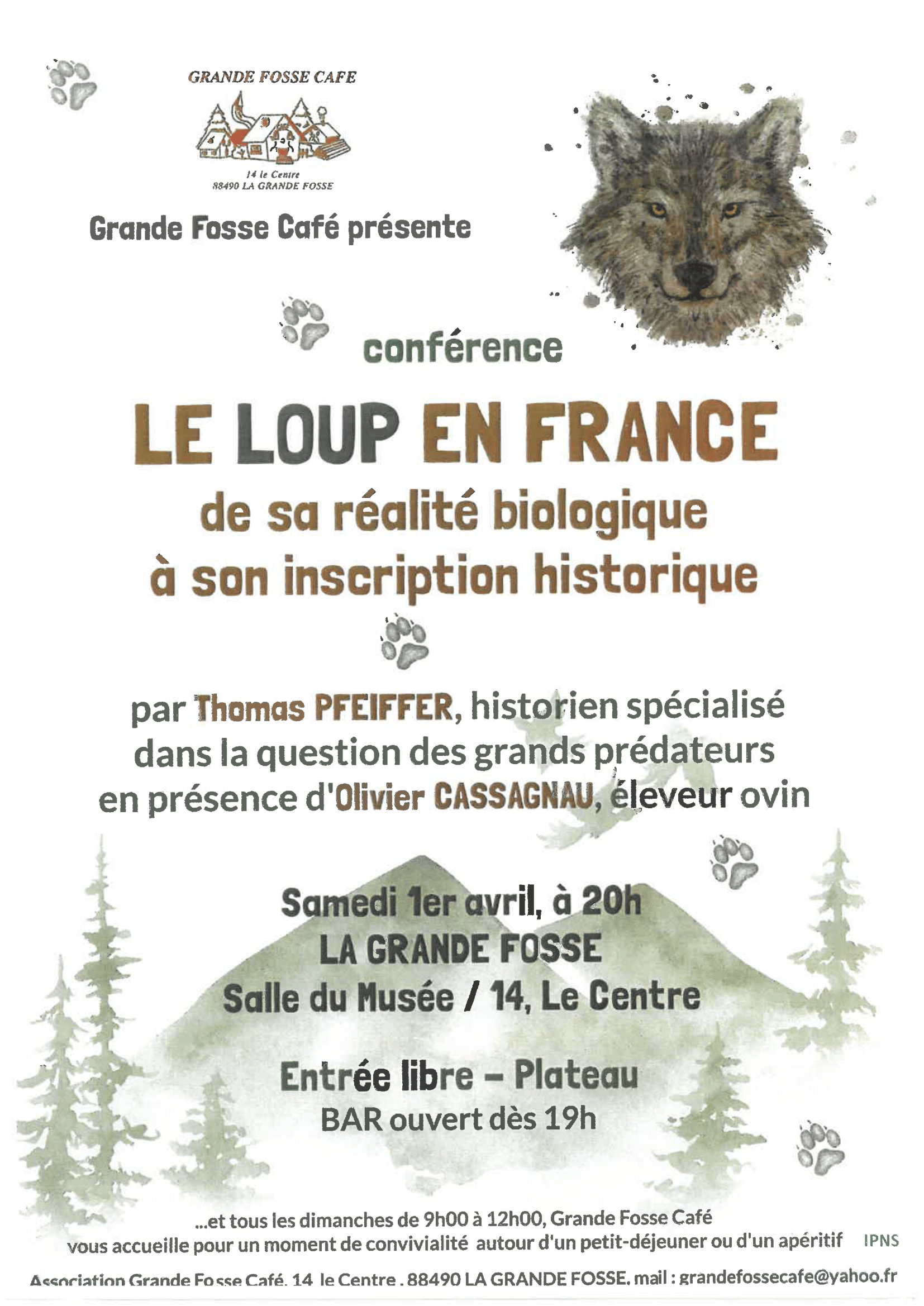 Le 1er Avril 2023 dès 20h00, l’association Grand Fosse Café organise une conférence sur le Loup en France, de sa réalité biologique à son incription historique. Elle aura dans la salle du Musée au 14, Le Centre, à la Grande Fosse.