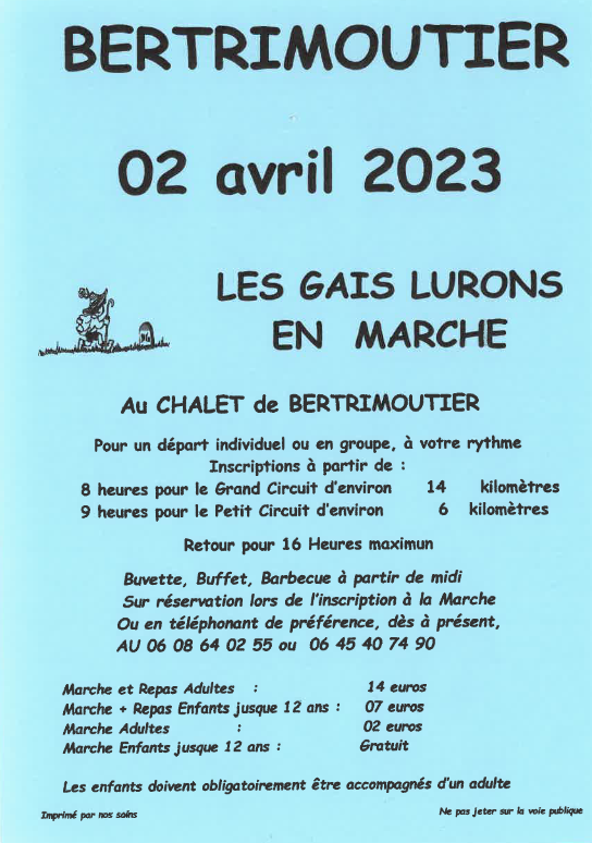 Les beaux jours reviennent et les Gais Lurons repartent en randonnée à Bertrimoutier, dimanche 2 Avril, avec une nouvelle journée de marche ! Un moment convival et chaleureux à vivre en compagnie des Gais Lurons en plein air !