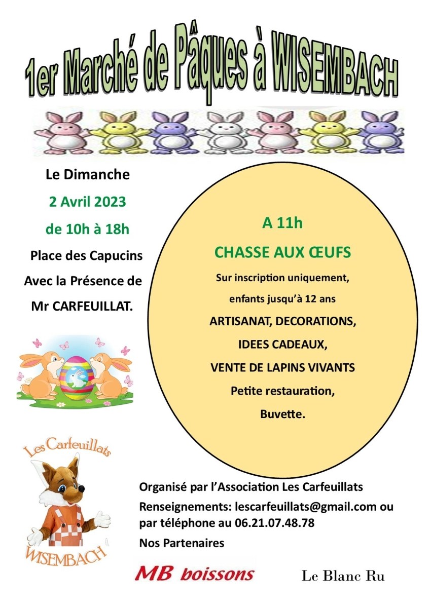 Rendez-vous sur la place des Capucins à Wisembach pour le 1er Marché de Pâques de l’association Les Carfeuillats le 2 Avril de 10h00 à 18h00 !