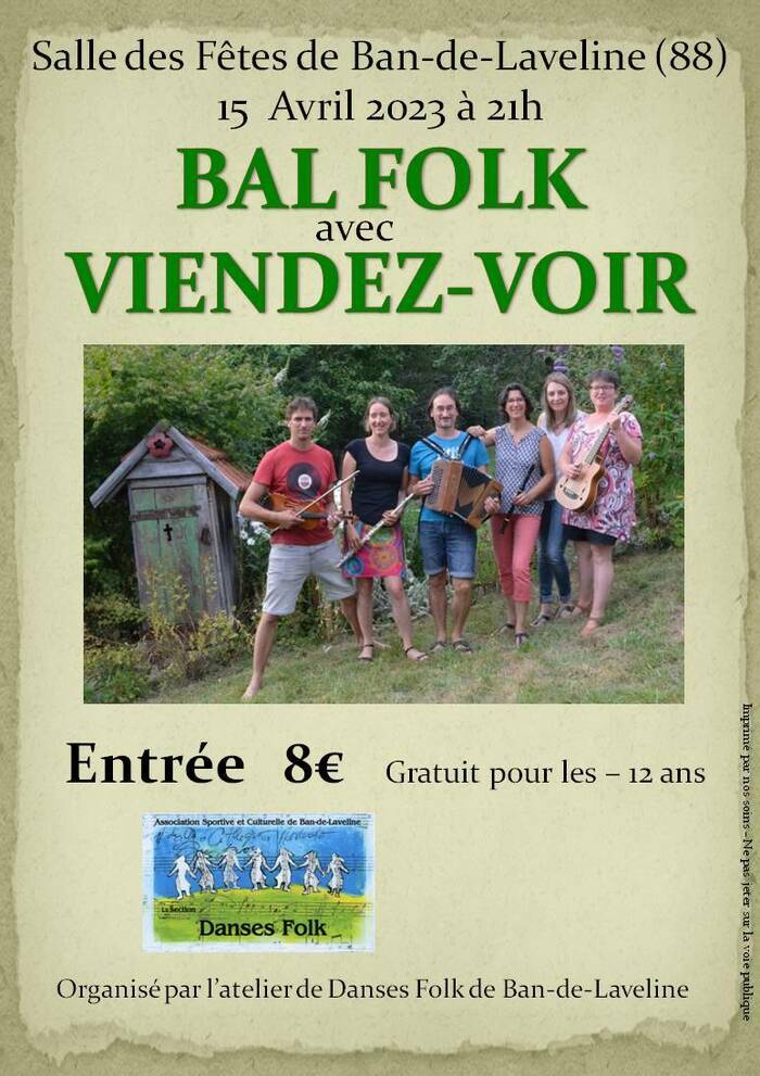 Rendez-vous avec l’ASCB Danses Folk au bal folk demain, samedi 15 Avril, dès 21h00 à la Salle des Fêtes de Ban-de-Laveline avec le groupe lorrain de musique Viendez Voir !