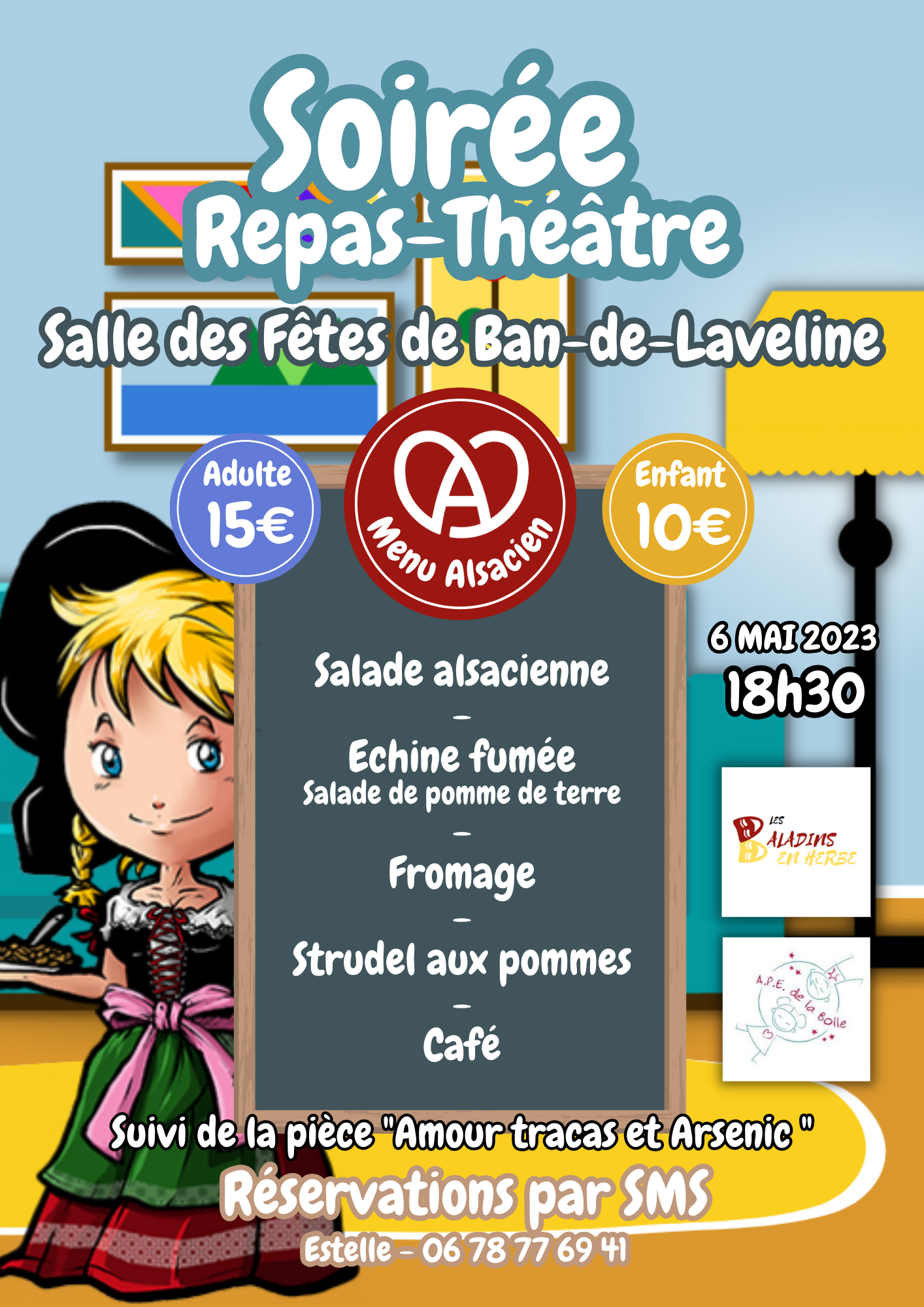 Pour participer à ce repas-théâtre unique dans l’année, réservez vos places obligatoirement au près d’Estelle au 06 78 77 69 41 par SMS. Tarif : 15 € par adulte et 10 € par enfant (pour les -12 ans).