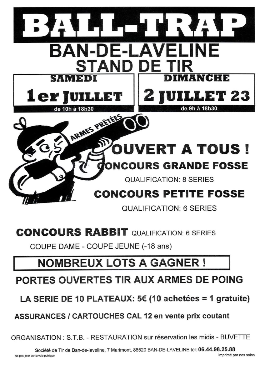 Rendez-vous au stand de tir de Ban-de-Laveline les 1er et 2 Juillet 2023 pour des concours de ball-trap « Grande Fosse », « Petite Fosse » et « Rabbit » avec prêt d’armes, organisés par la société de tir de Ban-de-Laveline !