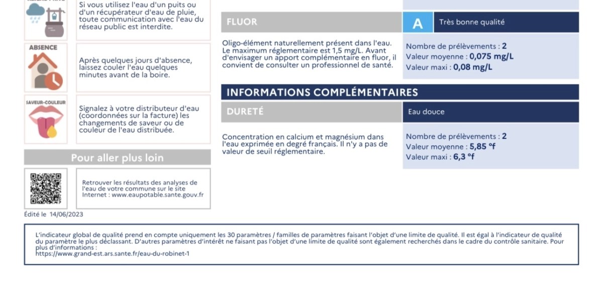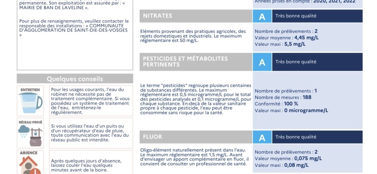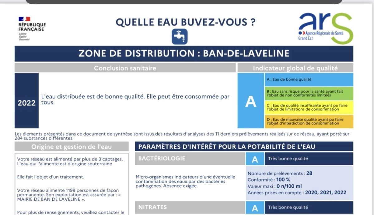 Ce document est également disponible sur le site internet de la commune : comme vous pouvez l’observer, la qualité de l’eau à Ban-de-Laveline est très bonne !
