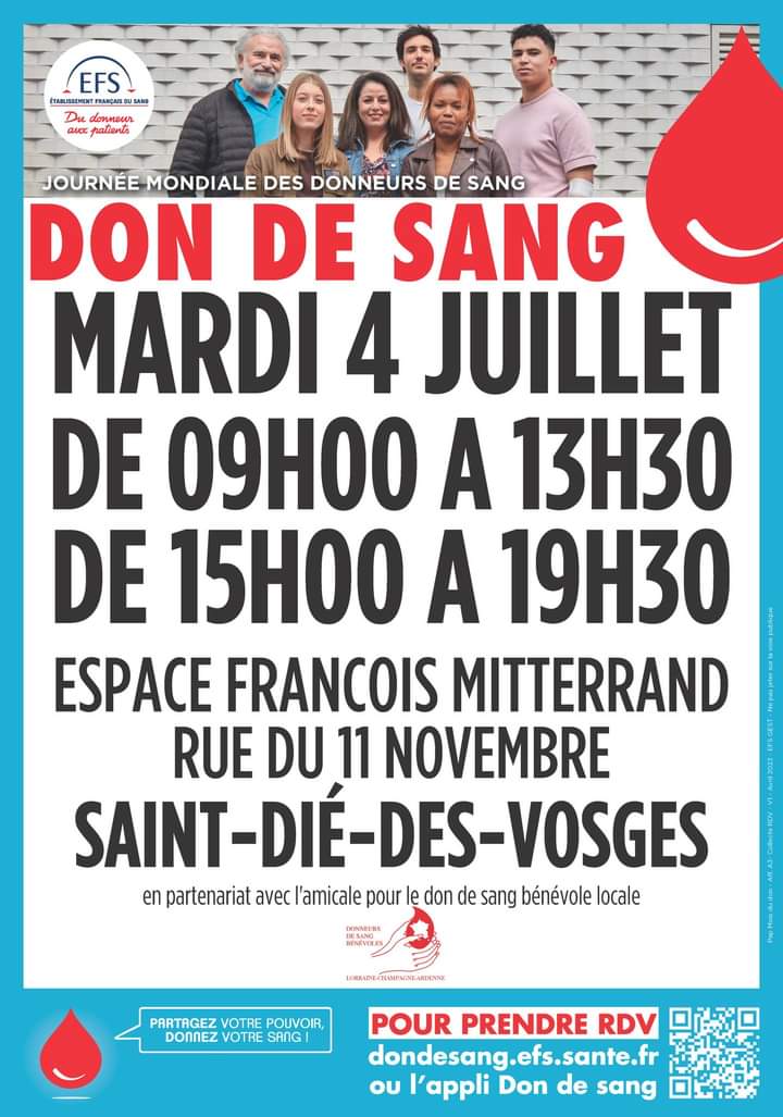 La prochaine collecte de sang mobile à Saint-Dié-des-Vosges se déroulera ce mardi 4 Juillet à l’Espace François-Mitterrand, de 9h00 à 13h30 puis de 15h00 à 19h30.