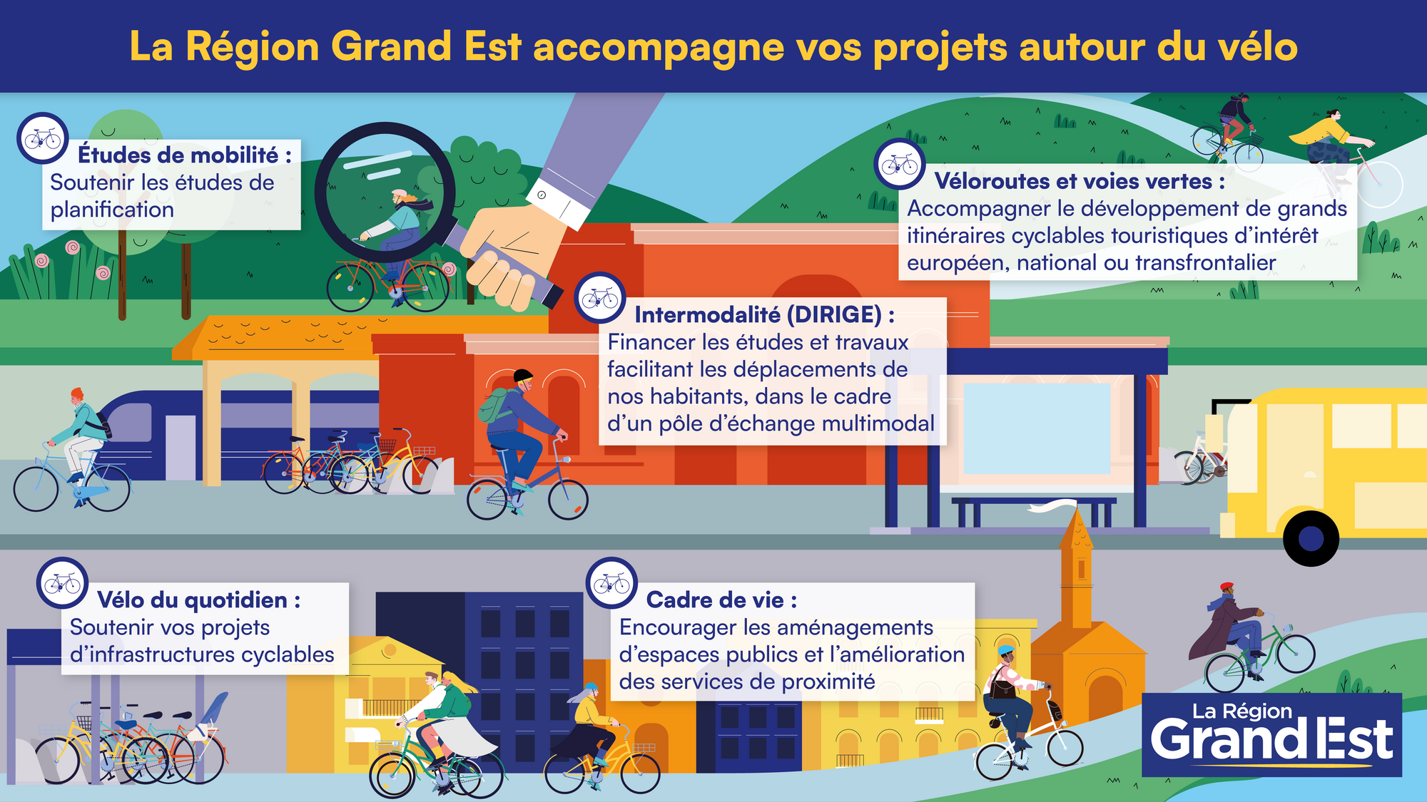 En plus de ces mesures, la Région Grand Est favorise l’intermodalité train/vélo sur le territoire, via des expérimentations durant l’été 2023 ! Dans les lycées et structures régionales, les pratiques cyclables sont également vivement encouragés et soutenues !